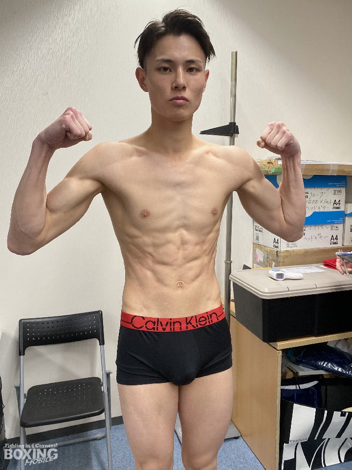 拳を交える松野は、200gアンダーの66.4kgでパスした。取材に応じた松野は「相手の映像を見たが、成長しているのを感じた。しかし、自分も強くなっているので、明日は返り討ちする。圧倒的に勝つ」と勝利に自信を示した。