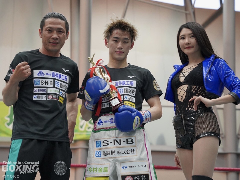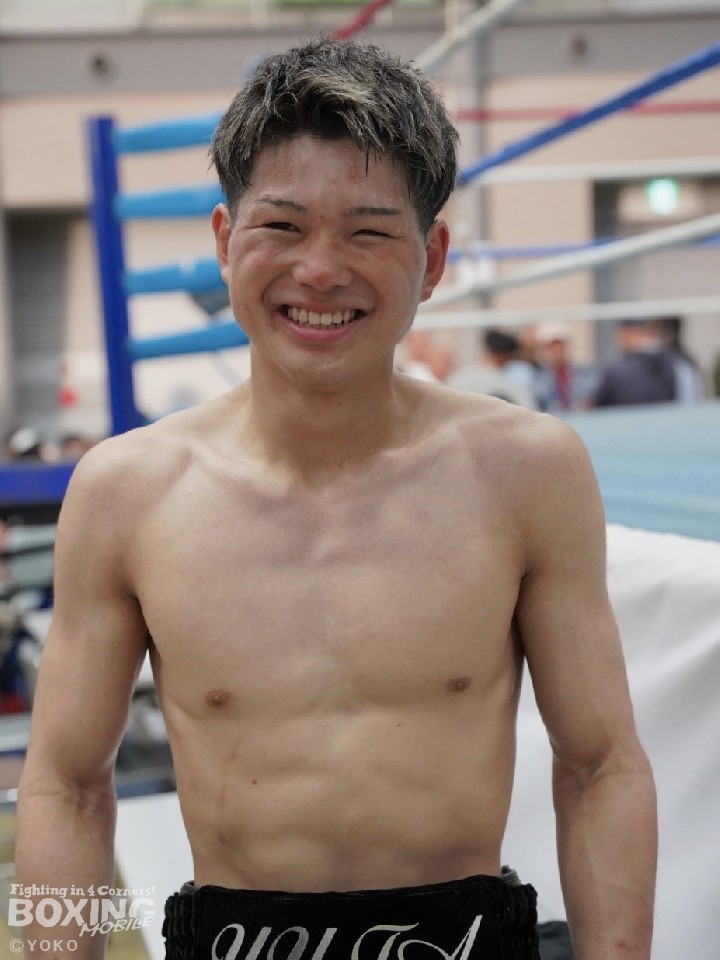 メインイベントは、村井貴裕(32=名古屋大橋)から初回に右でダウンを奪った二瓶竜弥(25=DANGAN郡山)が、判定勝利を掴んだ。試合後のリングでは、勝利者インタビューが行われ、「愛知で3連勝できた」と、遠征先の愛知のリングとは、相性がいいと喜んだ。スーパーバンタム級8回戦で掴んだ貴重な一勝。「早く日本ランカーになりたい」と、アピールした。