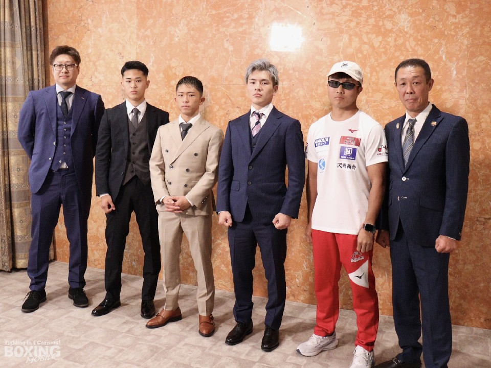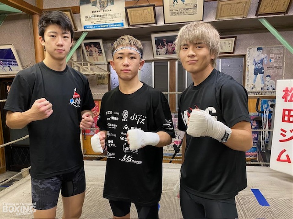 2023年全日本スーパーバンタム級新人王の武藤涼太(写真左/19)やB級ボクサーの犬塚音也(写真右/21)といった同門と切磋琢磨している。「自分にとって同世代の2人の存在は大きい」。かつて2人の世界チャンピオン(畑中清詞、薬師寺保栄)をはじめ、幾多のチャンピオンを輩出している松田ジム。現在は、10代から20代前半の選手が所属しており、昨年の全日本新人王決定戦では武藤がMVPを獲得。着実に結果を残している。