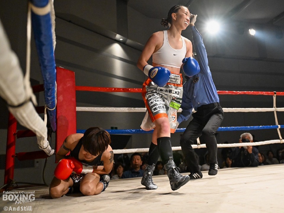 開始早々、高倉は右ストレートでダウンを奪うと、相手の左を警戒しながら上下に打ち分け攻勢。右ボディストレートで痛烈なダウンを奪い、10カウントを聞かせた。