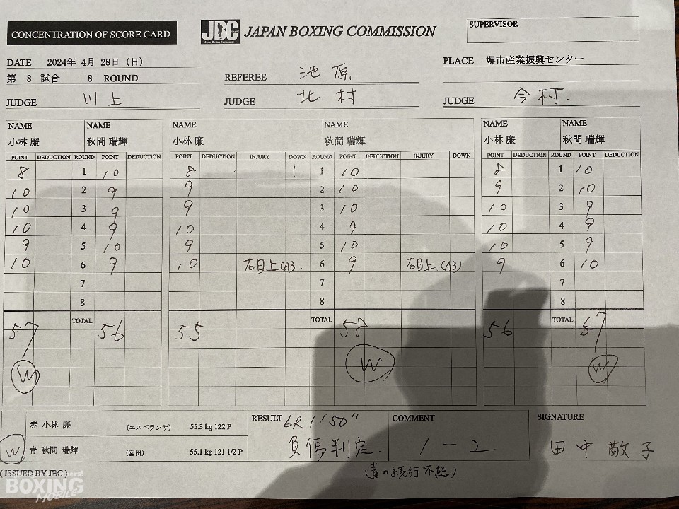 秋間が前の手で揺さぶりをかけながらリズムを作ると、ジャブでダウンを先取。絶好のスタートを切った。3〜4回、小林はプレスをかけて左ボディを痛打。ポイントを挽回したが、秋間は5回、右ストレート、右ショートアッパーで見栄えの良さをアピールした。6回、偶然のバッティングで秋間は左頭部、小林は右目尻をカット。ドクターチェックの末、レフェリーはこれ以上の試合続行は不能と判断。勝負は負傷判定へと持ち込まれた。採点は割れたが、秋間で幕を閉じた。