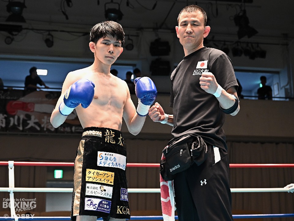 第3試合では、KG大和ジム片渕剛太会長を父に持つ片渕龍太(19=KG大和)が、東日本新人王ライトフライ級4回戦で、石崎聖也(21=レイスポーツ)と激突した。片渕がシャープなジャブで組み立てると、左フックでダウンを演出。再開後、上下に打ち分けてレフェリーストップに持ち込んだ。