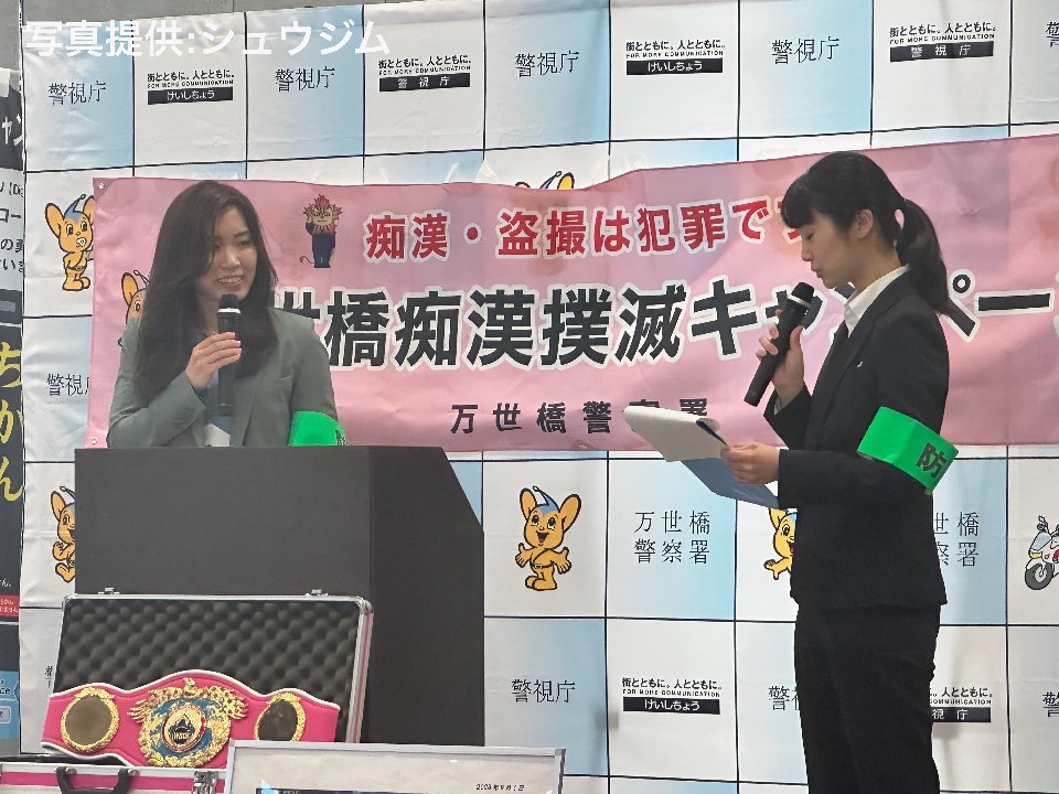 元WBO(世界ボクシング機構)アトム級王者の鈴木菜々江さん(シュウ→引退)が5日、東京千代田区万世橋警察署で行われた「令和6年度 秋葉原痴漢撲滅キャンペーン」にゲストとして参加し、女性向け防犯教室で状況に応じた具体的な防犯対策を学んだ。JR秋葉原前に移動し、街頭広報活動も行った。