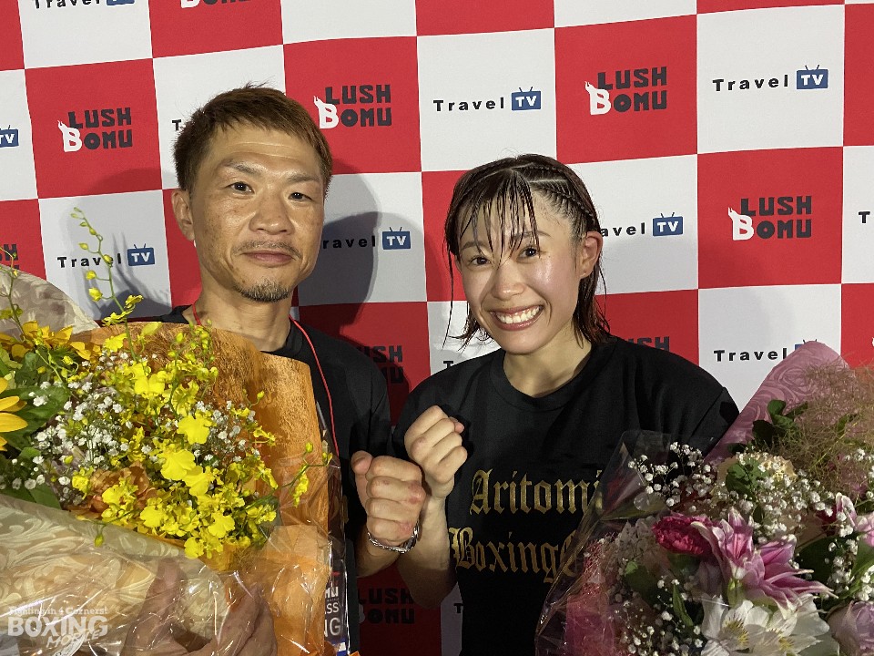 ARITOMIジムの有富康人会長は、「スパーリングを見ていて調子が良かったので、自信を持ってリングに上げた。よくやってくれた」と、愛弟子の勝利に目を細め、「ここからがスタート」と今後の活躍に期待を寄せた。