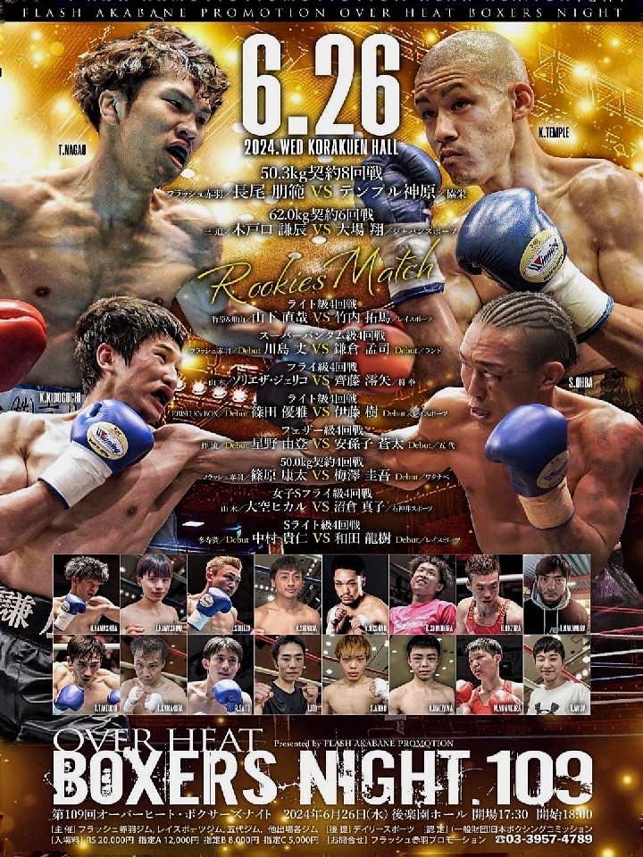 フラッシュ赤羽ジム主催の「OVER HEAT BOXERS NIGHT.109」の前日計量が25日、都内の日本ボクシングコミッション本部事務局で行われ、メインイベント50.3kg契約8回戦で対戦する長尾朋範(29=F赤羽)とテンプル神原(26=協栄)の両者が計量に臨んだ。