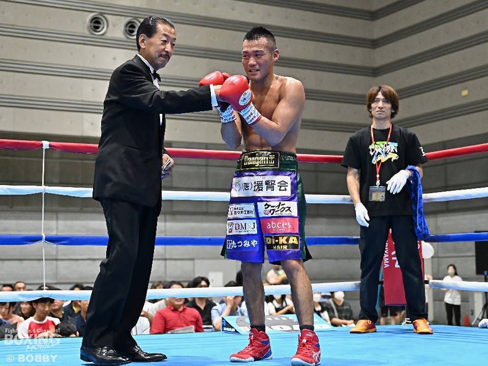 左のジャブ、フック、アッパーボディと組み立てが光った二瓶と坂本の対決は、徐々に二瓶がテンポを上げて、リーチの長い右ストレートに繋いだ。手数の多いスピードに乗った技術戦に終止符を打ったのは、二瓶の右ストレート。坂本は顔面を弾かれると、一気に後退し、パンチをまとめた二瓶に対して、坂本のガードが遅れたのを見て、レフェリーが割って入った。