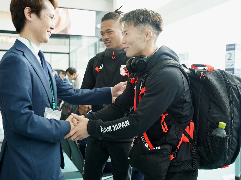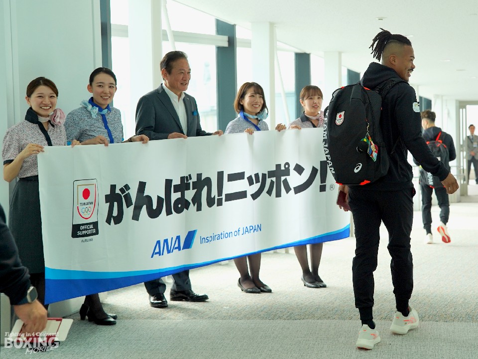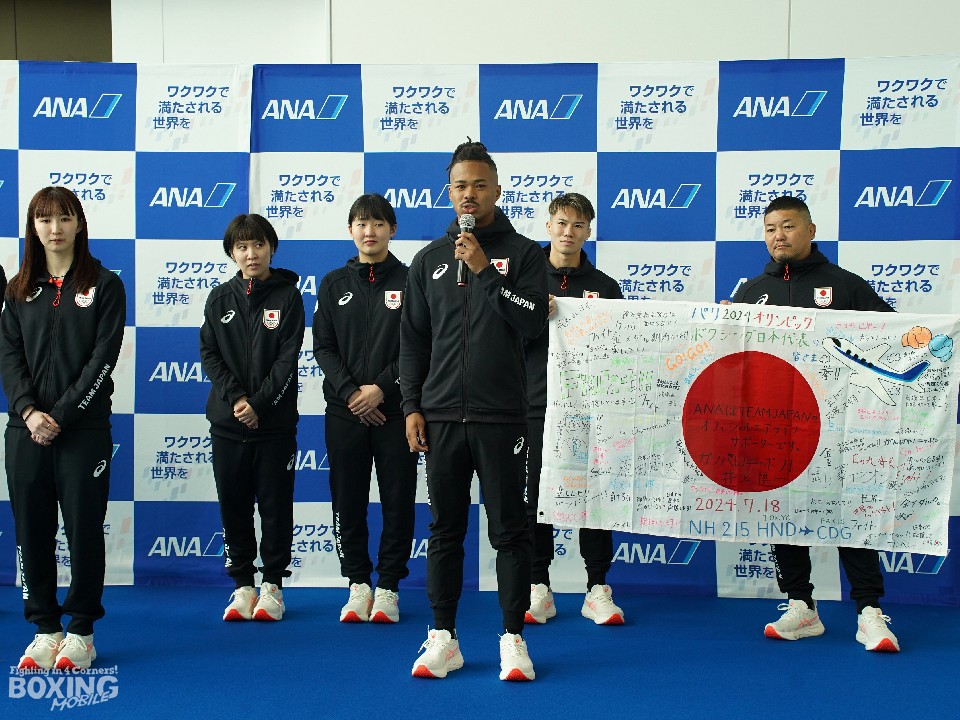 羽田空港第2ターミナルでは、7月10日から20日にかけ、ANA(全日本空輸)によるパリ五輪・日本代表の出発イベントが随時開かれており、その中をボクシング代表の男子57kg級・原田周大(専修大学)と男子71kg級・岡澤セオン(INSPA)が、7月18日のフライトで出発した。写真は井上慎一ANA社長とボクシング代表団の選手&コーチ。イベントでANA社員による応援メッセージの書かれた日本国旗が授けられた。