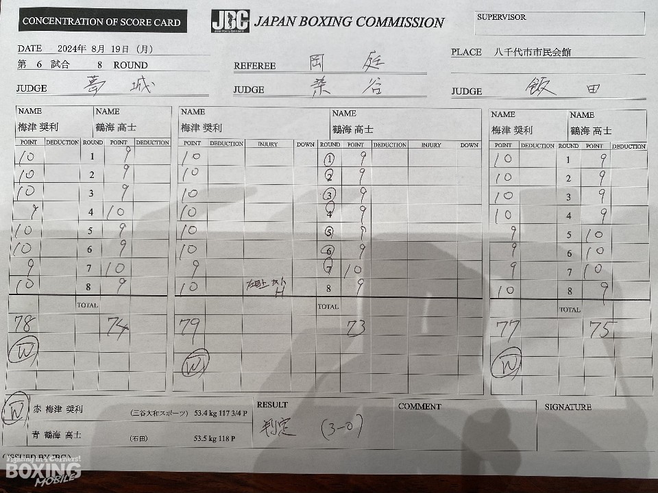 序盤から梅津がプレスをかけて左フックを好打。回転力を活かした連打で打ち合う中、フィジカルの強さを活かした梅津が、優勢をアピールした。7回、鶴海は右フックで膝を揺らして反撃したが、最終8回、梅津はギアを上げて押し切った。