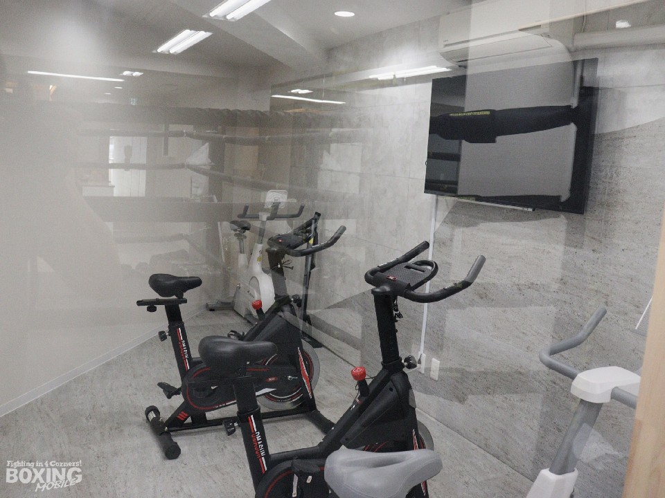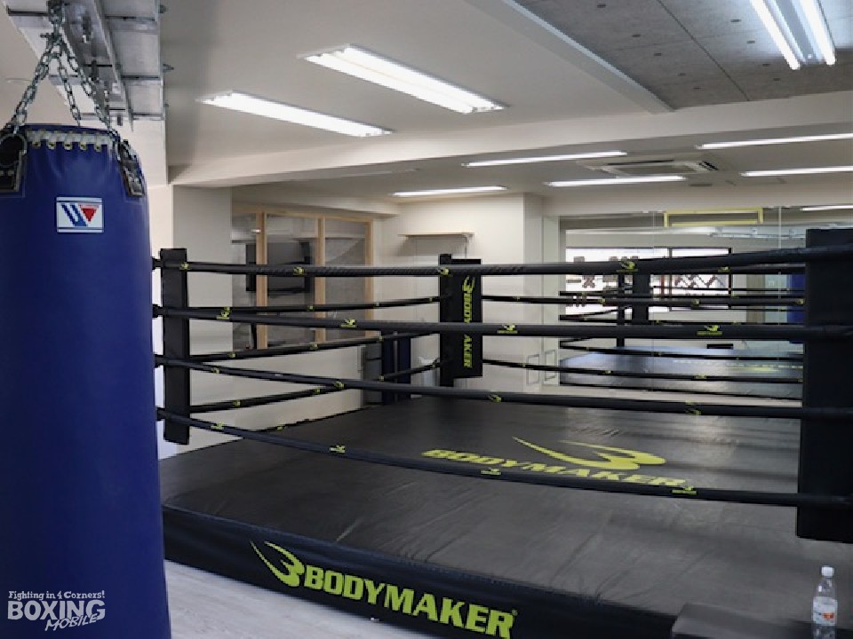 ジムは、リングとサンドバッグとシンプルな作りで、「サンドバッグは岡山君からもらって、リングは京都西院ボクシングジム(アマチュアジム)から安く譲ってもらいました。元々、不動産屋だった場所をそのまま使っているので、設備もおしゃれです」。白を基調としており清潔感がある。