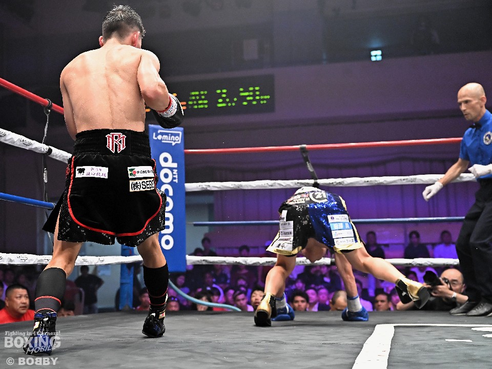 テンポよく頭を振って前に出る森に対して、サウスポーの松本は、ワンツーと右アッパーを好打してリズムを作った。5回終了後の途中採点は、49-46,50-45, 50-45で松本がリード。6回は松本がヒッティングの後にサイドにステップして、リズム感のある攻撃を披露すると、有効打で森の左目下が腫れた。試合が決まったのは7回、松本に右フックを合わせられた森がキャンバスに手をついたのを見たレフェリーがダウンを宣告。試合再開後に松本が左ストレートで森の顔面を弾いたところでレフェリーが割って入った。