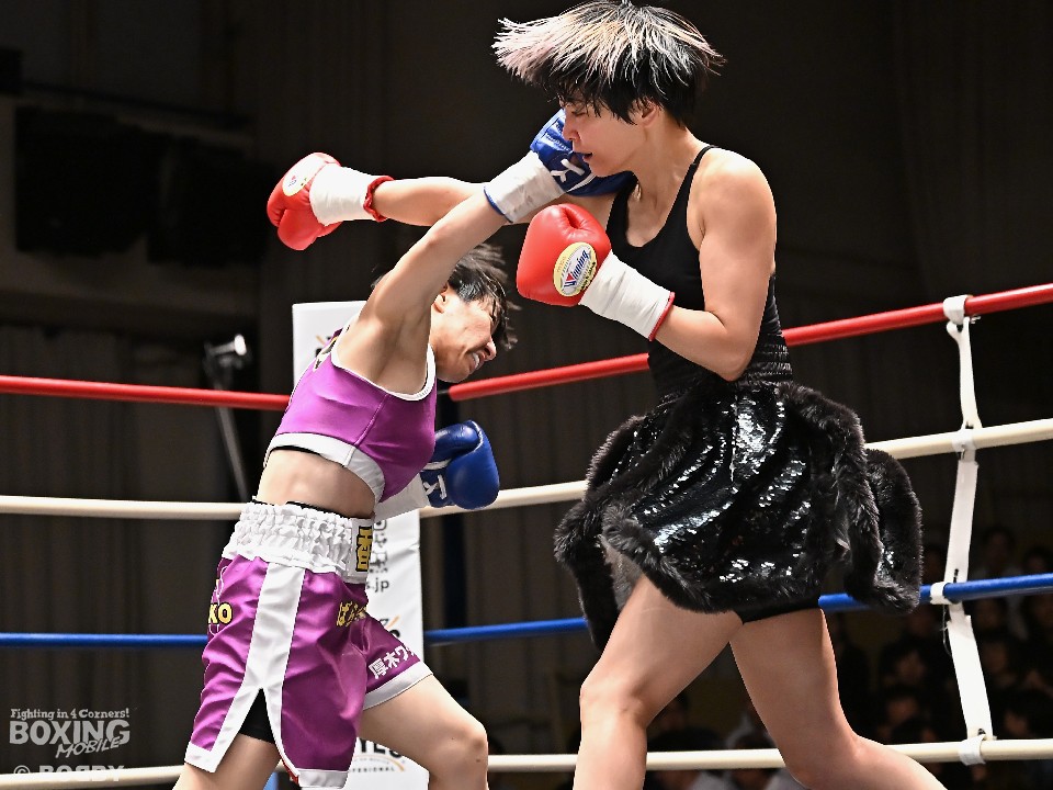 第3試合アトム級4回戦では、峰雪八(34=東京拳闘会)と佐藤香実(27=厚木ワタナベ)が拳を交えた。佐藤が巧みなブロックで被弾を回避すると、ワンツーを好打。ワンツーで顔を弾き、レフェリーストップに持ち込んだ。