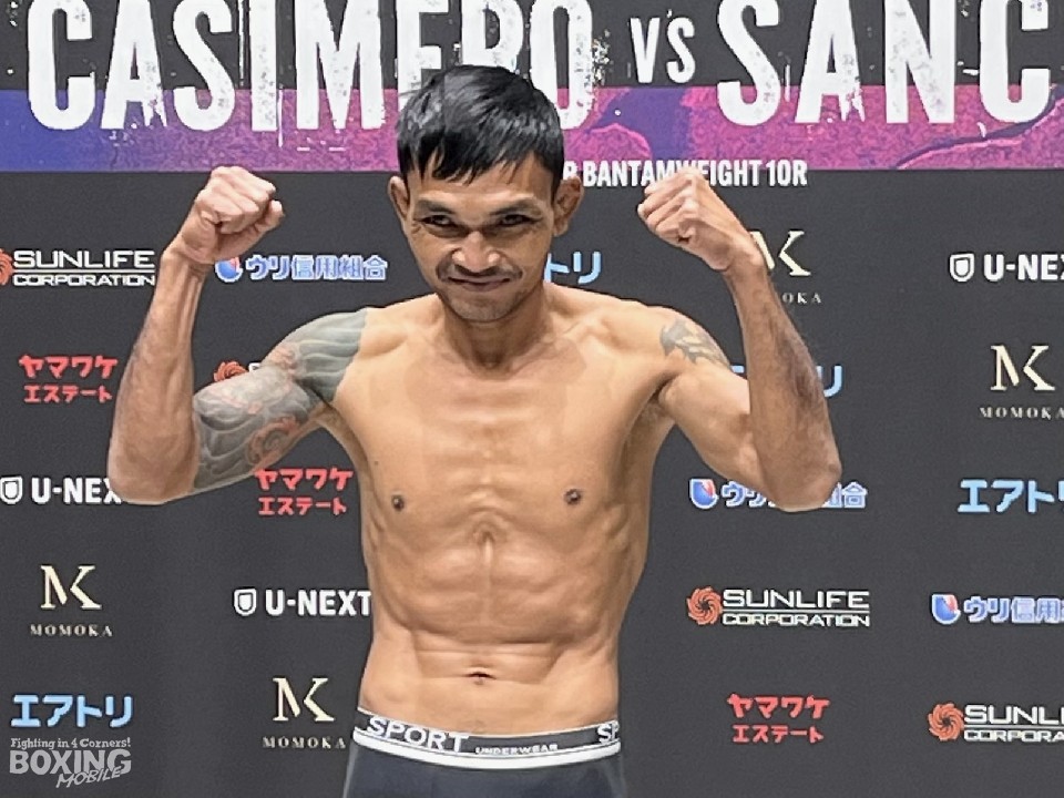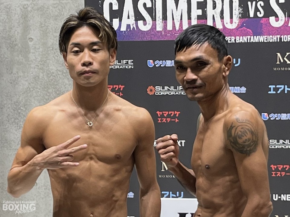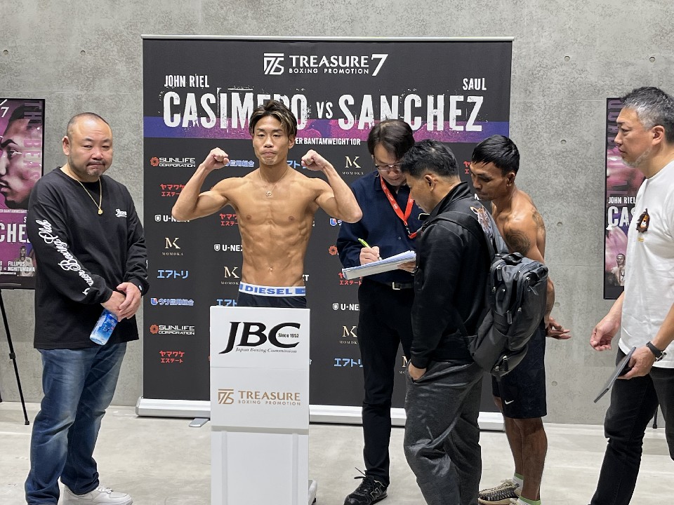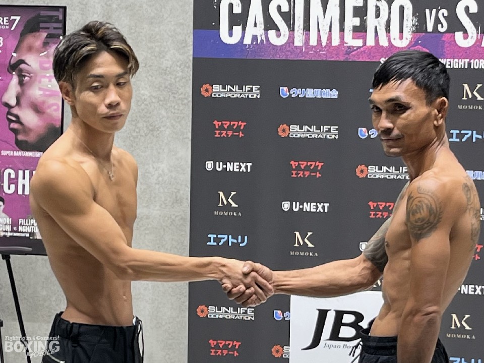 横浜武道館で開催される「Treasure Boxing Promotion 7」の前日計量が12日、都内で行われ、111lb(50.3kg)契約8回戦に臨む谷口将隆(30=ワタナベ)とパイ・パーロップ(41=タイ)が、顔を合わせた。