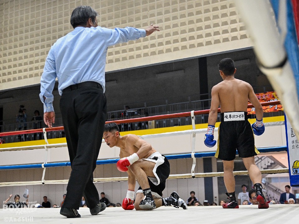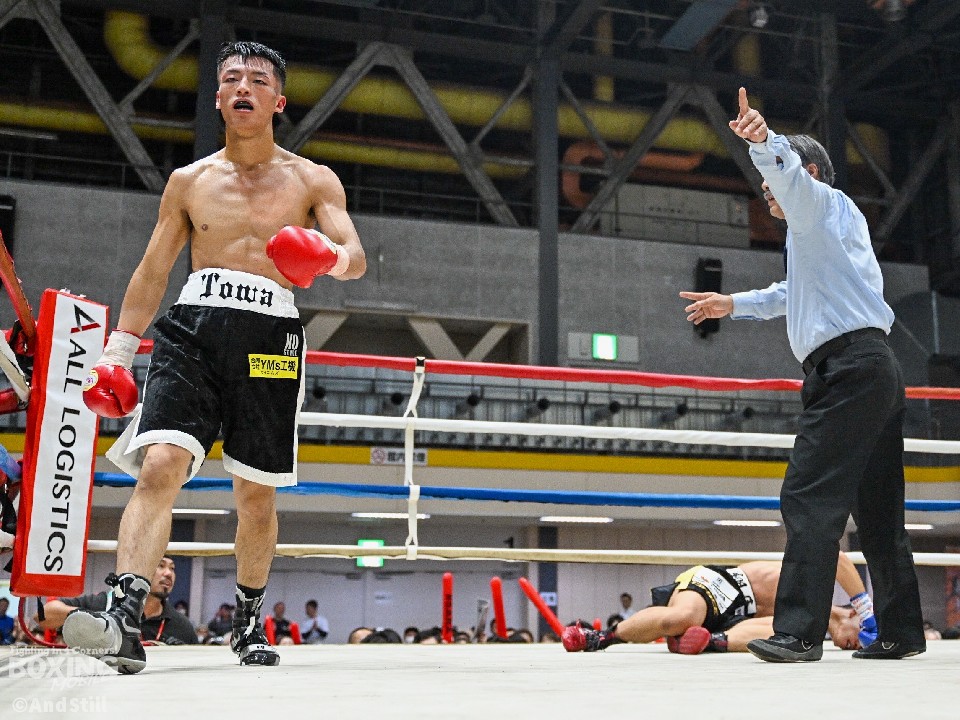 最初にダウンを奪ったのは、左フックを打ち抜いた西村翔馬。初回に試合が動いた。しかし、最終回、勝負に出た西村に対して、中村が左フックをドンピシャのタイミングでヒットすると、西村がゆっくりと崩れ落ちた。4ラウンド1分0秒TKO。
