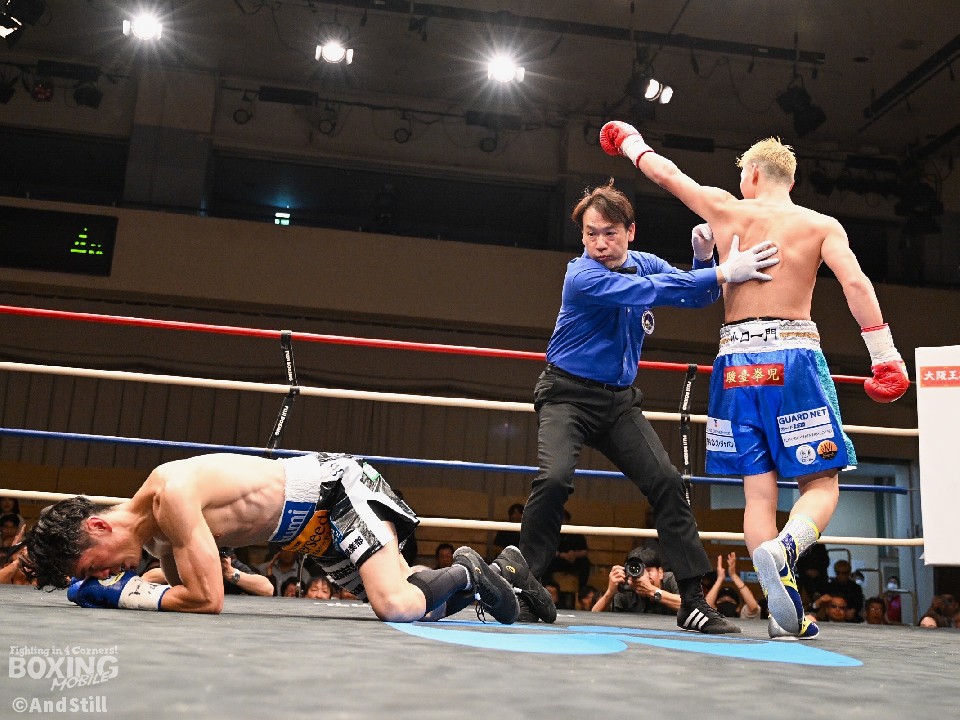サウスポー高山が重厚なプレスからワンツー、左ボディストレートを痛打。青山も気持ちを強く持って、ジャブから左ボディに繋げて応戦。開始から両者ともに打撃戦を繰り広げた。しかし、高山が強烈なパンチでダメージを蓄積させると、右フックでグラつかせてペースを握った。2回、高山は上下のコンビネーションから右フックをさく裂させ、ダウンを演出。青山に10カウントを聞かせた。