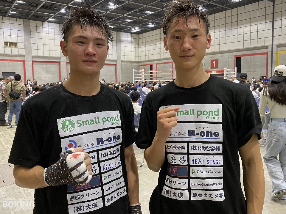 今年4月以来の再起戦を飾った松岡(写真:右)は「前に出てくる相手に対し、向こうの土俵で戦った。心が折れそうになったが、友人の声援で勇気づけられた。地元の試合だったので、勝利で恩返しすることができた」と声を弾ませた。