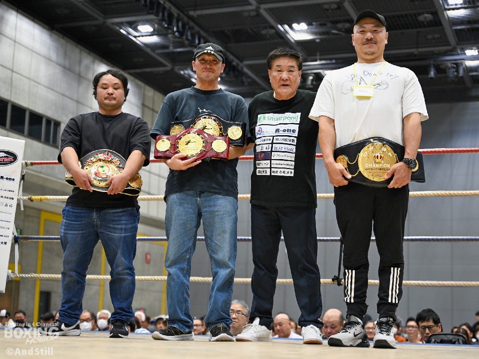 この日、アマチュア時代の教え子で、元日本スーパーフェザー級、OPBF東洋太平洋2階級制覇王者の渡辺雄二氏(写真左から2番目)、元日本・OPBF東洋太平洋ミニマム級王者の原隆二氏(写真左)、元OPBF東洋太平洋ウェルター級王者でTRIBE SHIZUOKA YAMAGUCHI DOJO会長の山口裕司氏(写真:右)がリング上で挨拶した。