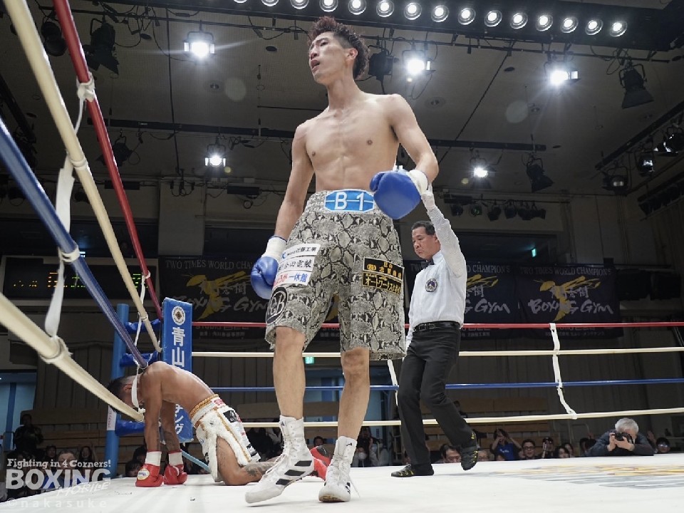 落合壱星(24=セレス)はメインイベント、バンタム級8回戦でダンリック・スマボン(25=比)と激突。サウスポー落合が左ストレートから仕掛けるのに対し、スマボンは独特のタイミングからの右フックで顔を弾き応戦。神経戦を打ち破ったのは5回。落合は左ボディアッパーで動きを止めると、プレスを強めて左ボディアッパーで、スマボンをキャンバスに沈めた。