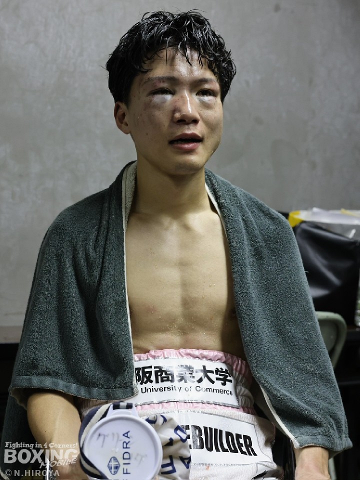 試合を振り返って「相手はノーランカーだったが、油断出来ない相手だった。思った以上に粘りがあった。前半にペースを掴まれてしまったのが苦戦の原因」と、腫れた痛々しい顔で述べた。