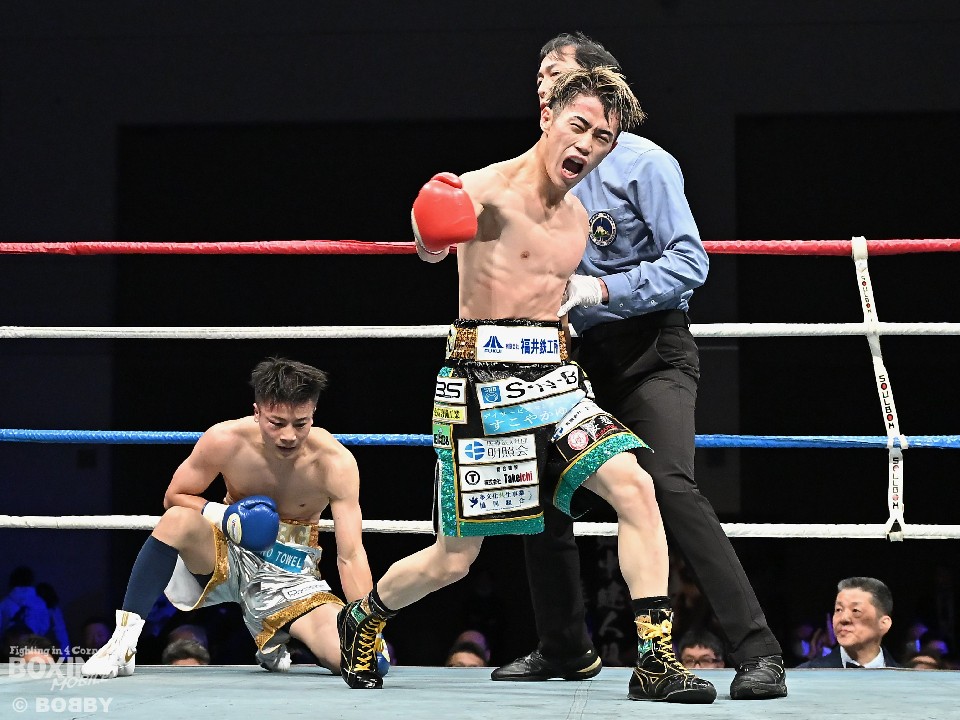 ワンツーを軸にパンチを上下に散らした坂井は、3回には左フック、4回にはボディ連打でダウンを奪い、6ラウンドには右ストレートで森野をコーナーに吹っ飛ばすと、左フックを返してダウンを奪いフィニッシュ!