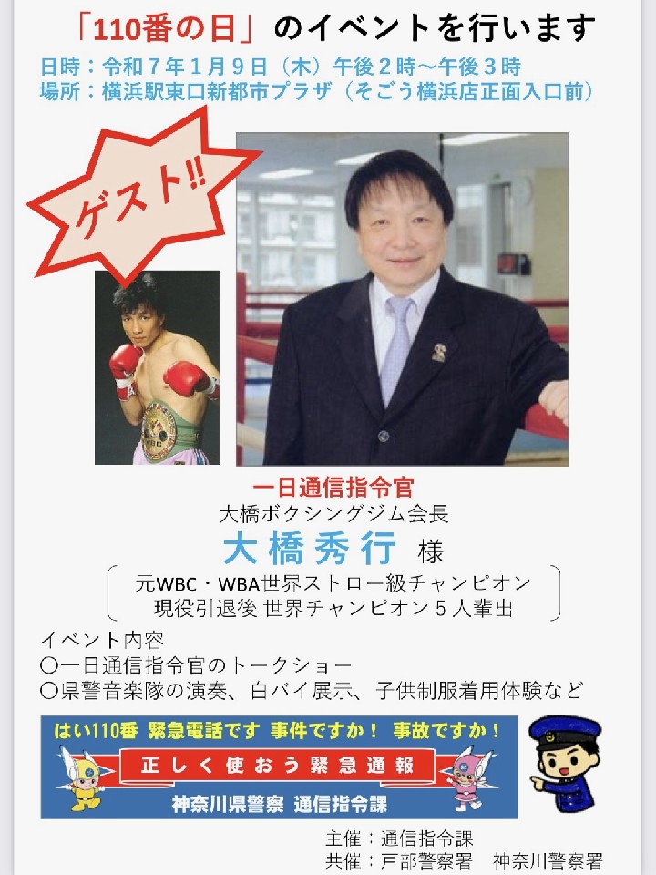 横浜の大橋ボクシングジムの大橋秀行会長が2025年1月9日(木)、横浜駅東口にある、新都市プラザで開催される神奈川県警の「110番の日」のイベントで、「一日通信司令官のトークショー」を行う。