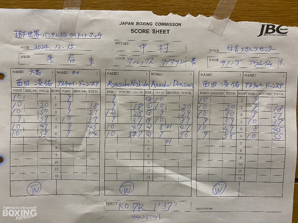 序盤、サウスポー西田は距離を保ちながらジャブを軸にペースを掌握。4回、アヌチャイは独特のタイミングからの右アッパー、右フックで反撃。5回、西田は右フックを合わせてダウンを奪うと、左ボディストレートを突き刺しゲームメークした。アヌチャイは強引に打って出て気持ちの強さを見せる。いつもより被弾した西田だが、7回にカウンターの左ボディアッパーで2度目のダウンを演出。アヌチャイに10カウントを聞かせた。
