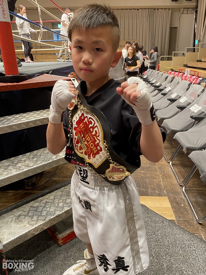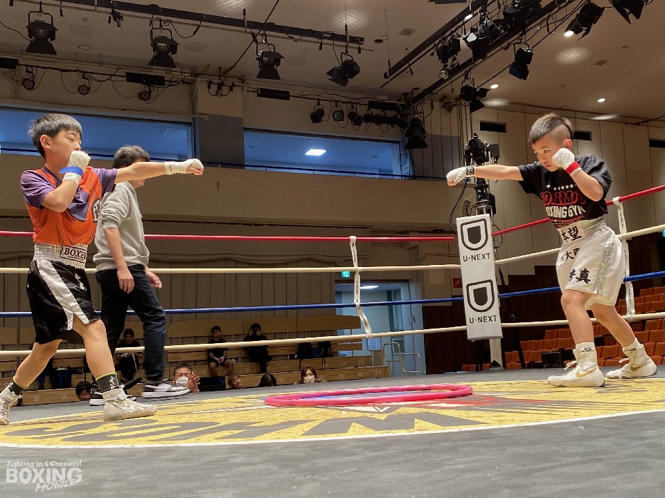 U-12部門を優勝したのは加賀谷秀真君(11=本望)。回転力を活かした素早い動きで観客を唸らせた。小学2年生からボクシングを始めた加賀谷君は、「後楽園ホールで優勝できてうれしい」と声を弾ませた。