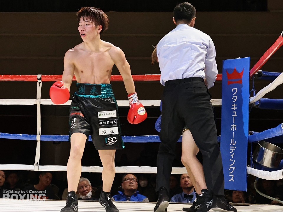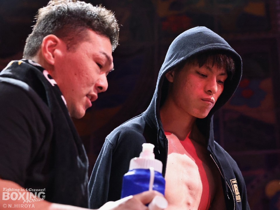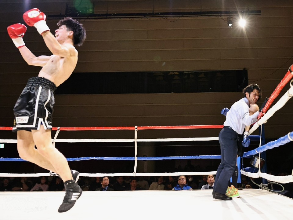 第6試合50.5kg契約4回戦では、中迫樹来(23=SFマキ)と菅能滝地(かんのう・りゅうち/17=陽光アダチ)が激突。中迫が右ショートで腰を沈めさせて攻勢。左ボディを織りまぜたコンビネーションで攻め立てた。右カウンターで逆転を狙う菅能に対し、攻撃の手を緩めずレフェリーストップに持ち込んだ。