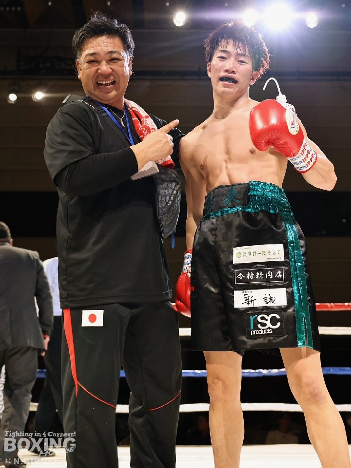 見事なKO勝ちを飾った社納は「今日は、出だしから相手のパンチが見えて、動きが軽かった。ダウンを奪ったワンツーには、手応えを感じた」と勝利を喜び、元日本スーパーフライ級王者の奥本貴之トレーナーに対して、「分かりやすく教えてくれるので、強くなっているのを実感する。勝って褒めてもらったので、本当にうれしい」と、感謝の気持ちを述べた。