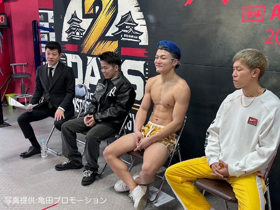 会見には、亀田ジムの亀田興毅会長も出席し、試合を行うことが正式に決まった花田颯(22=KWORLD3)、佐々木る玖(22=KWORLD3)、中川麦茶(36=ミツキ)を紹介した。