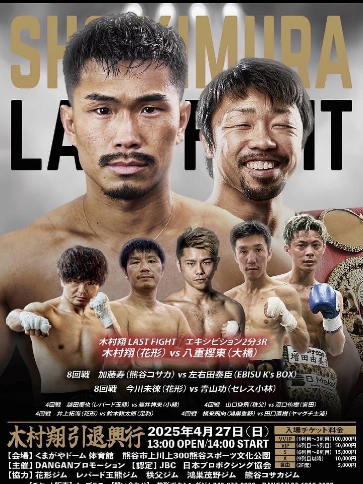 引退式は、4月27日(日)に地元・埼玉県熊谷市のくまがやドーム体育館で開催される「木村翔引退興行」で行われ、元世界3階級制覇王者で、現在は大橋ジムでトレーナーを務める八重樫東氏との3分3ラウンドのエキシビジョンマッチも予定している。