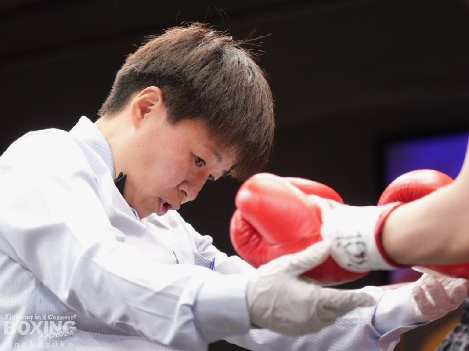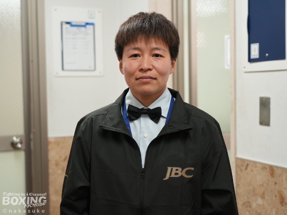 2021年3月の試合を最後に引退した花形さんは、「主人(岡庭健JBC審判員)から、人員が少ないと聞いたので、支えになれればと思った。ボクシング界に恩返しがしたかった」と述べ、昨年8月からレフェリーとジャッジの研修を重ねてこの日を迎えた。