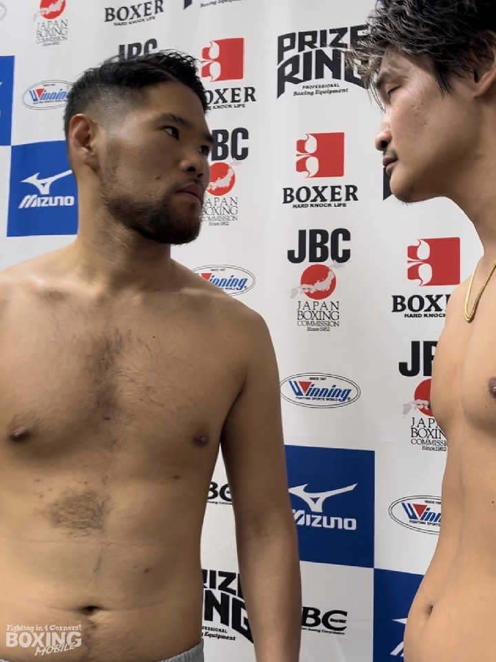 日本スーパーミドル級チャンピオンの帝尊康輝(32=一力)が23日、都内の日本ボクシングコミッション事務局で行われた「ファイティングビー34」の前日計量の最後に登場、78.0kg契約8回戦で対戦するパク・キヨル(29=韓国)と顔を合わせた。