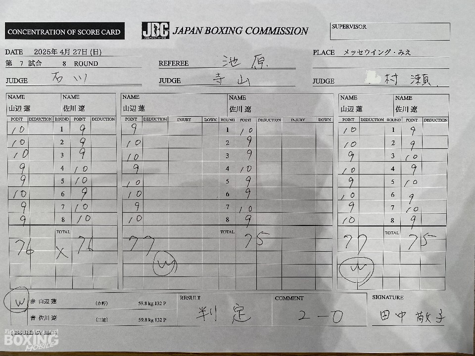 佐川が右ボディストレートを差し込めば、サウスポー山辺は、リターンの左ストレートで対抗。ラウンド毎にジャッジの採点が割れるシーソーゲームを繰り広げた。6回、山辺は逆ワンツーで効かせて攻勢をかけるが、佐川は7回に左ボディを痛打。8回、山辺は回転力を活かした連打で押し切り、優勢を印象付けた。ジャッジ2者の支持を得た山辺が勝利した。