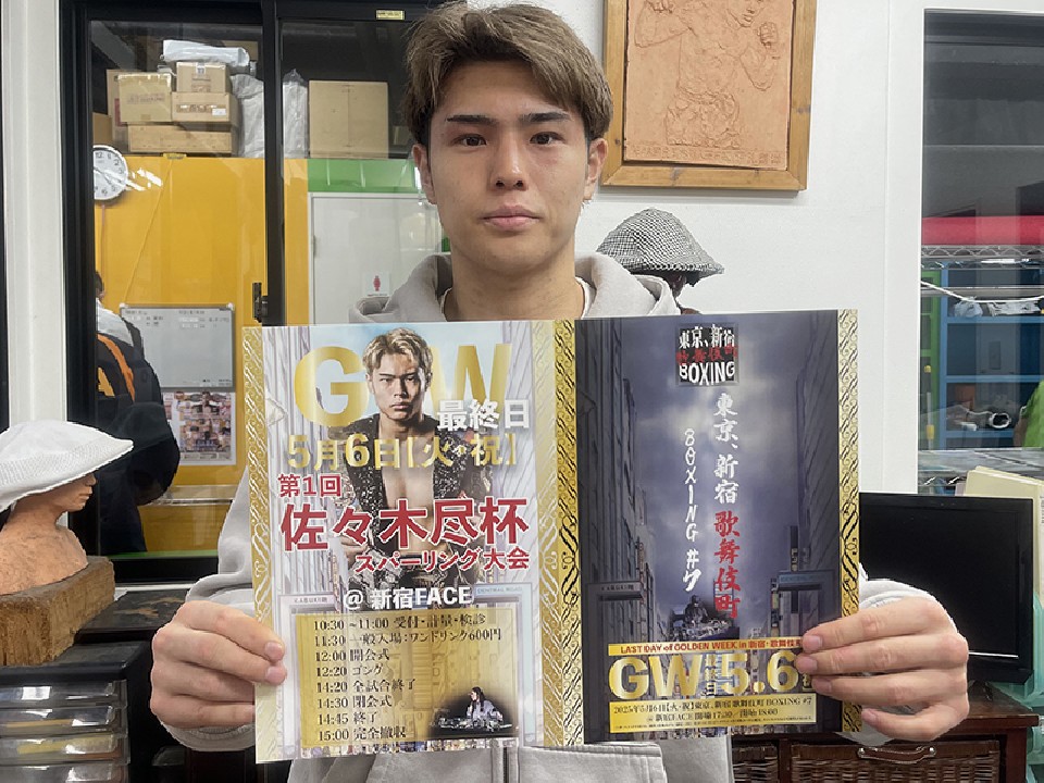 試合が行われる5月6日(火・休)の昼には、6月19日(木)に世界初挑戦を迎えることを発表した佐々木尽(23=八王子中屋)の名前を冠としたスパーリング大会『第1回 佐々木尽杯』が行われる。