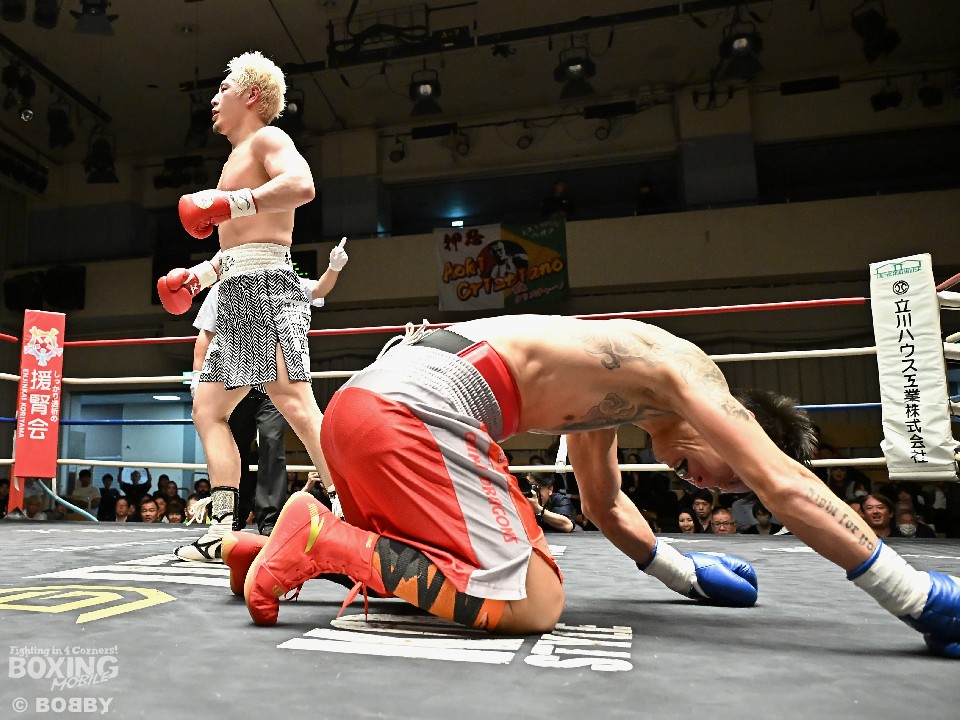 鈴木がジャブを突きながらプレスをかけると、左ボディを好打。強気に打ち返したジンだが、鈴木が慌てる素振りは見せず、じっくりと攻め立てた。3回、鈴木は左ボディでダウンを奪うと、最後は強烈な左ボディで、ジンをキャンバスに沈めた。強打を浴びたジンは苦悶の表情を浮かべたまま、しばらく起き上がることができなかった。