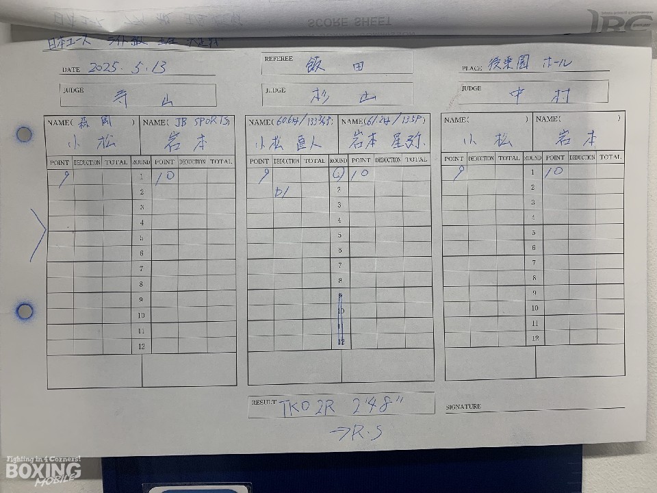 岩本が右ストレートで仕掛けると、サウスポー小松も右ボディで対抗。ラウンド終盤、岩本は回転力を活かした連打で攻め立てた。2回、プレスを強めた岩本は、左フックで効かせてパンチをまとめてダウンを奪うと、レフェリーはノーカウントで、試合をストップした。