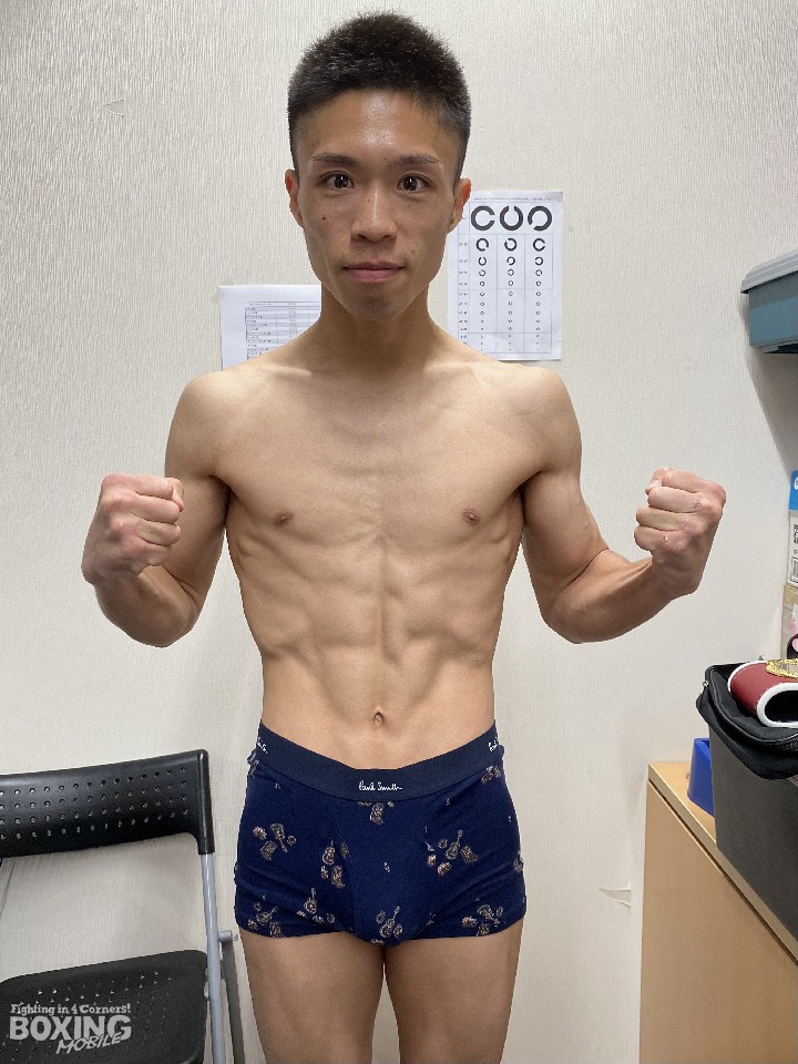 先に秤に乗った谷口は、契約体重を100g下回る51.4sでクリアした。「ライトフライ級から2.6s増での試合なので、減量はまったく問題なかった」と話したが、「その分、相手も当日大きくなってくる。コンドル選手を見て、気合いが入っているのを感じた。(自分自身も)より気合いが入った」と1階級上の稲葉を警戒した。