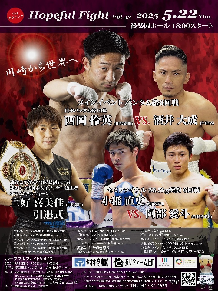 一方、53.4kgでクリアした酒井は、「相手は距離感、スピードなどトータルで見ても自分より上。簡単に自分の思い通りの展開にできるとは思っていないか、負ける気ではここに来ていない。この試合に向けて4月中旬に1週間、以前所属していた角海老宝石ジムで出稽古をした。久しぶりの後楽園ホールのリング(約3年3ヶ月ぶり)なので楽しみたい」と、意気込みを語った。
