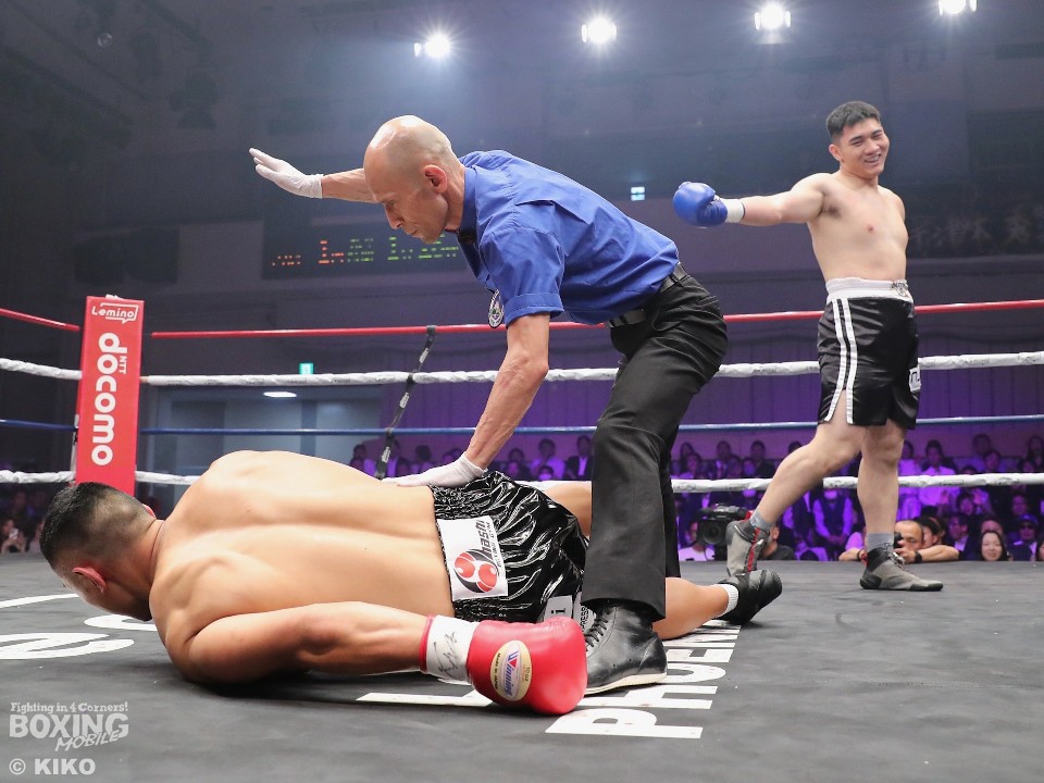 ファンが左右フックでグイグイと攻め立てると、右フックを叩きつけてダウンを先取。ファイティングポーズを取った星にすぐさま迫ると、右フックでグラつかせてフィニッシュに持ち込んだ。優勝候補の星が1回戦で敗れる波乱の展開に、会場は騒然となった。