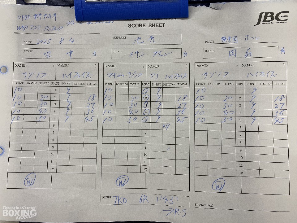 WBOアジアパシフィック・OPBF東洋太平洋ライトヘビー級王座決定戦が4日、後楽園ホールで開催された「LifeTime Boxing Fights28」のメインイベントで行われ、WBO-AP同級1位、OPBF同級11位のマキシム・サゾノフ(31=ロシア/中国)とWBO-AP同級5位、OPBF同級7位のアリ・ハイフェーズ(36=マレーシア)が空位の2冠王座を争った。