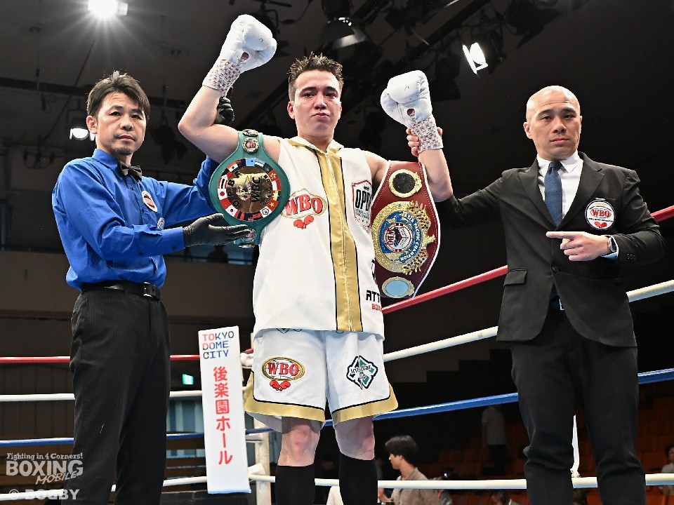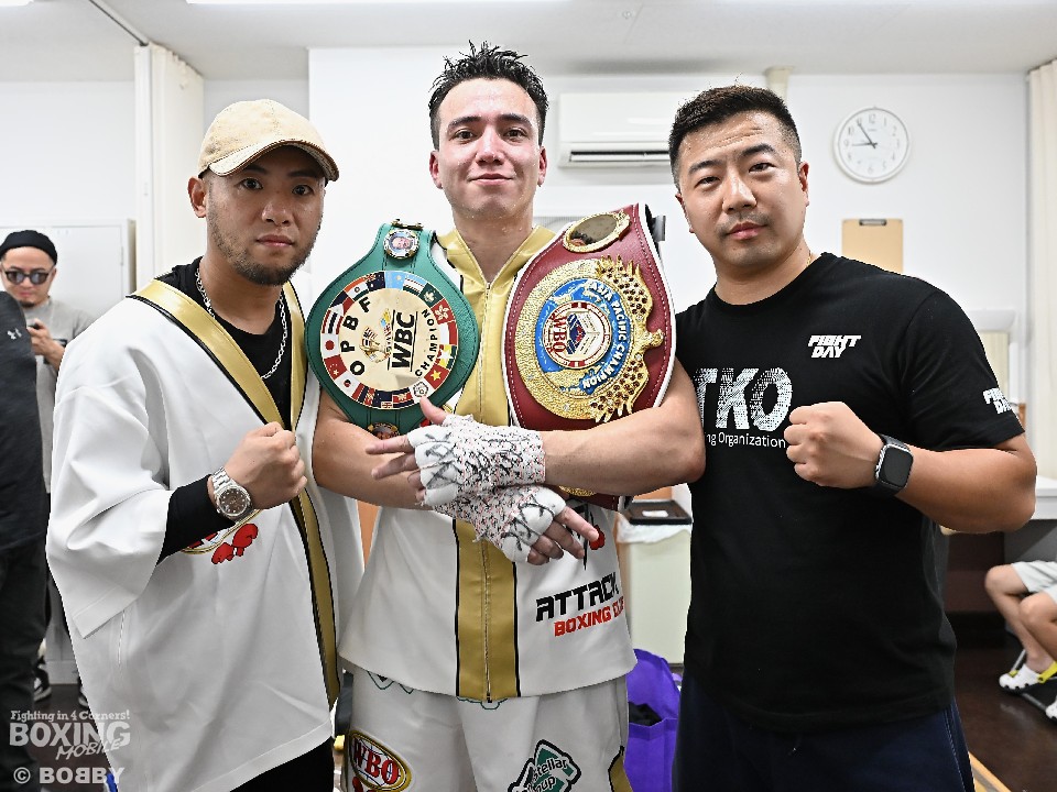 ライトヘビー級2冠王者に輝いたサゾノフは、「試合を組んでくれたトップキングプロモーションと志成ジムに感謝したい。憧れの後楽園ホールのリングでベルトを獲ることができて、本当にうれしい」と大粒の汗を拭いながら笑顔を見せた。