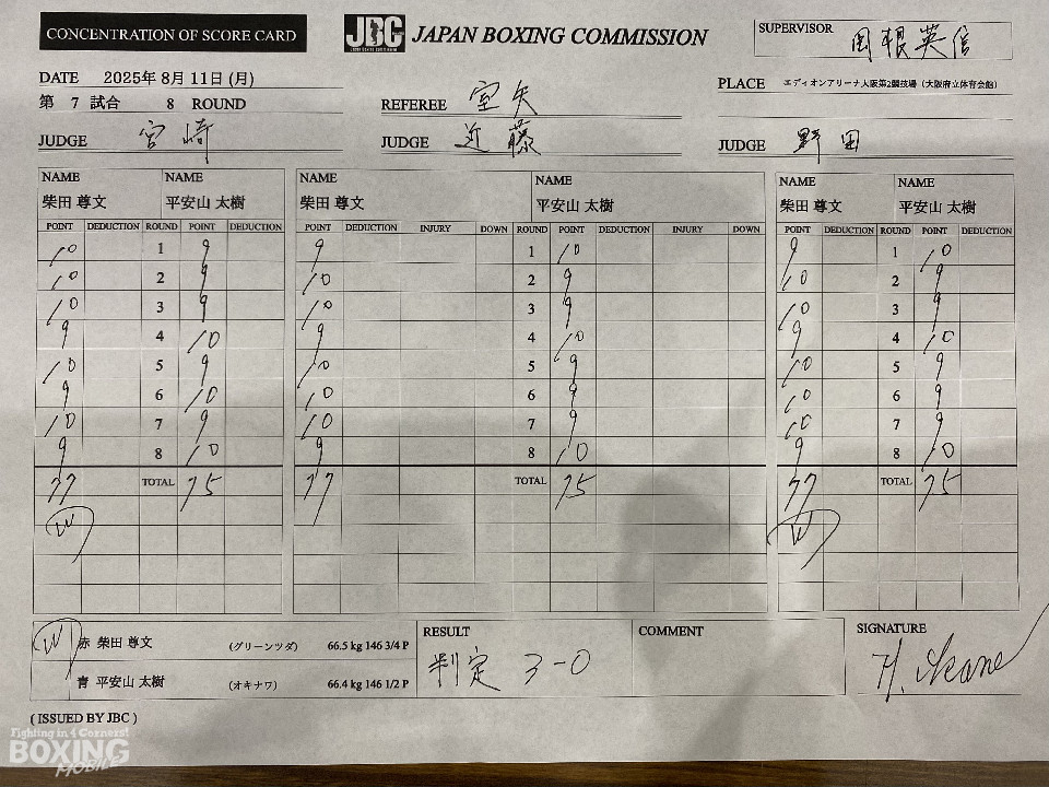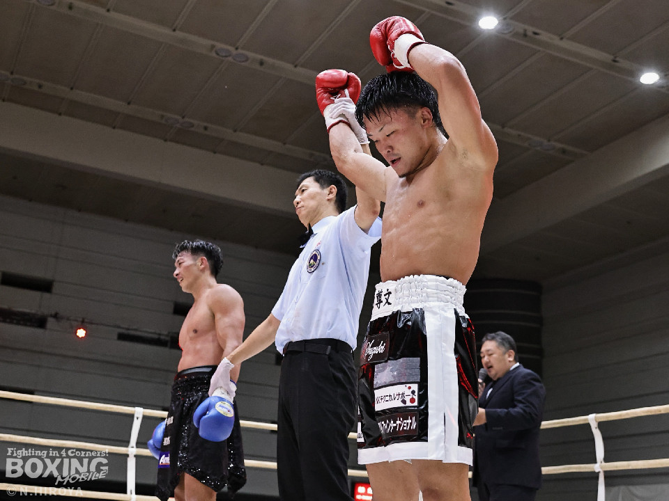 初回、平安山は左ボディで先制したが、柴田はジャブを軸に丁寧な組み立てを意識。お互いに警戒してか、決定打が出ない展開に。中盤以降、柴田はジャブの見栄えの良さでポイントを連取。最終8回は激しい打撃戦に発展する中、平安山の回転力が上回った。中盤を押さえた柴田が再戦を制した。