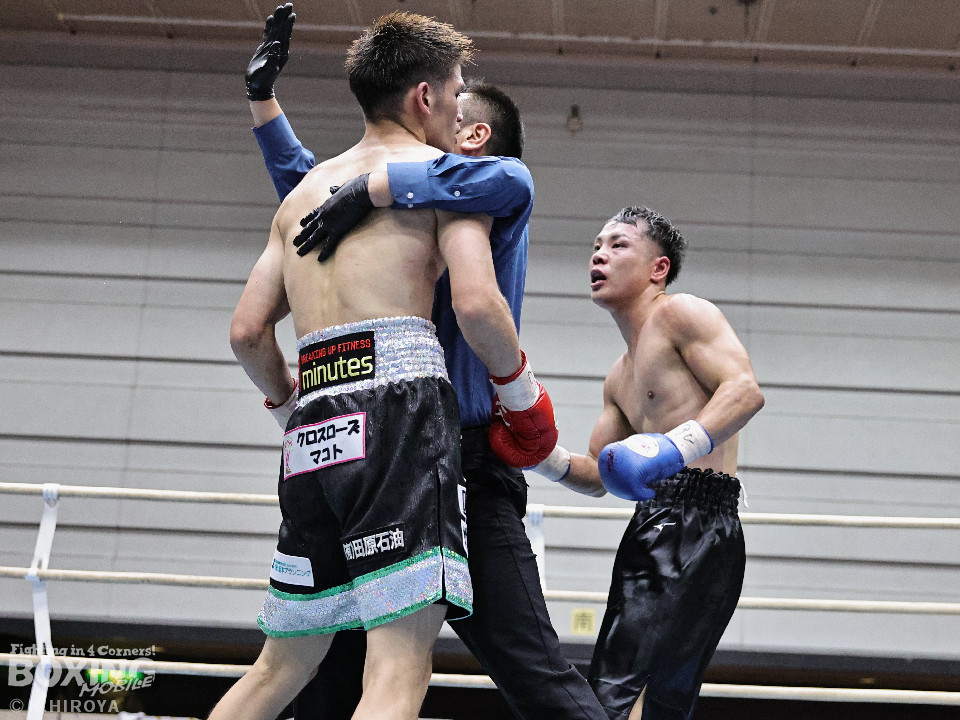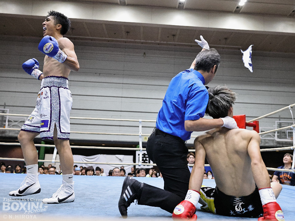 初回、ワンツーでバランスを崩させ、連打でたたみかけ、福本からダウンを先取、再開後の連打でレフェリーストップを呼び込み、見事な初回KOで勝利、連続KO記録を更新した。