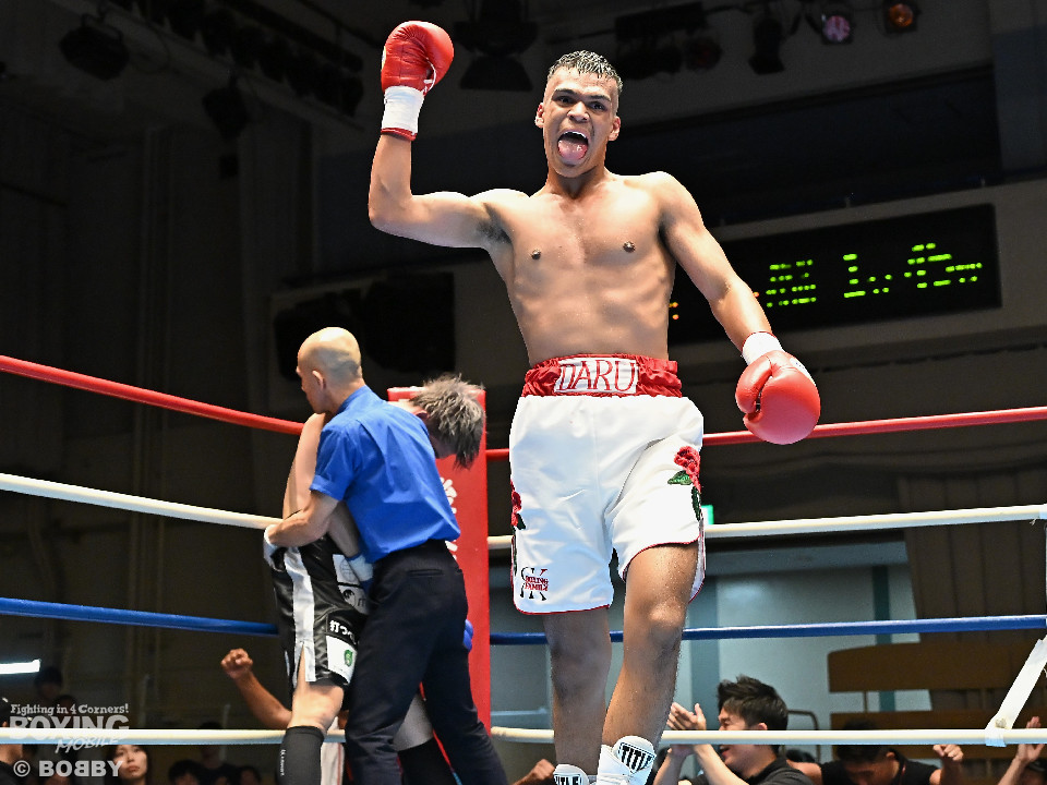 ネパール出身のカドカが、出入りを活かしながら、多彩な左のコンビネーションで先制攻撃。鴇田はガードをしながら右クロス、左ボディを返し応戦。初回から会場を盛り上げた。2回、カドカは回転力を活かした連打で攻め立て、3回にワンツーで効かせると、怒涛の連打でレフェリーストップに持ち込んだ。