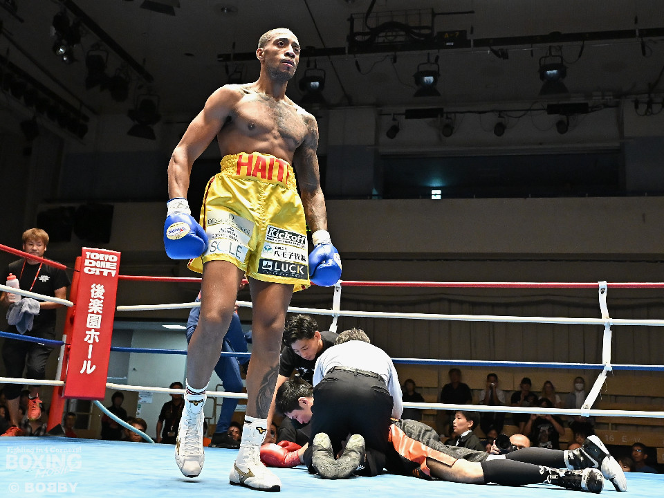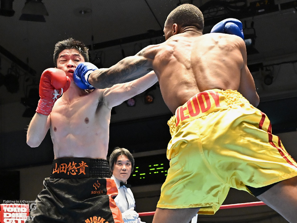 第10試合のミドル級4回戦は、山田悠貴(34=一力)とジュディ・クレッグ(29=リングサイド)の一戦。山田の右オーバーハンドを浴びてダウンしたクレッグだったが、左フックで倒した。2回、クレッグはジャブで山田をグラつかせると、再び左フックでフィニッシュにつなげた。ダウン応酬の激闘を制し、クレッグがKO勝利で決勝へ進んだ。