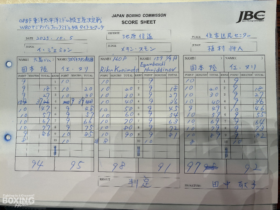 初回からヌリはテンポ良く攻撃を仕掛けるも、国本は堅いガードで前へとプレス。ジャブから左ボディへとつなげ、ヌリも応戦する形でミドル級ならではの迫力ある打ち合いに発展した。中盤以降は国本のパワーが上回り、ヌリを後退させる場面も増えていく。最終10回、ヌリのジャブを浴びた国本がダウンを喫する波乱もあったが、すぐに立ち上がり冷静にワンツーを返した。最後まで意地と意地がぶつかり合う激闘は、国本に軍配が上がった。