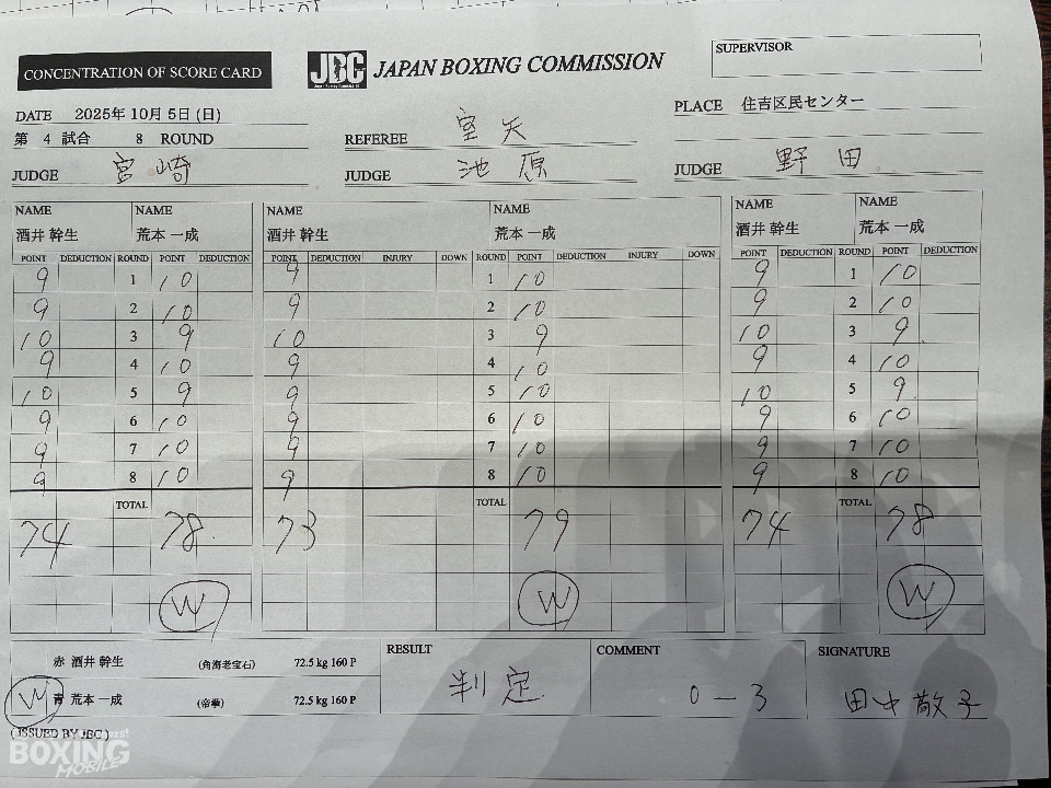 勝利した荒本は、リング上のフラッシュインタビューで、「酒井さんの気迫を感じた。相手のボクシングに付き合ってしまったが、やりたいことは少しは出せた」と振り返り、「プロになって初めての地元関西での試合。声援が聞こえて、愛されていると実感した」と感慨深げに語った。