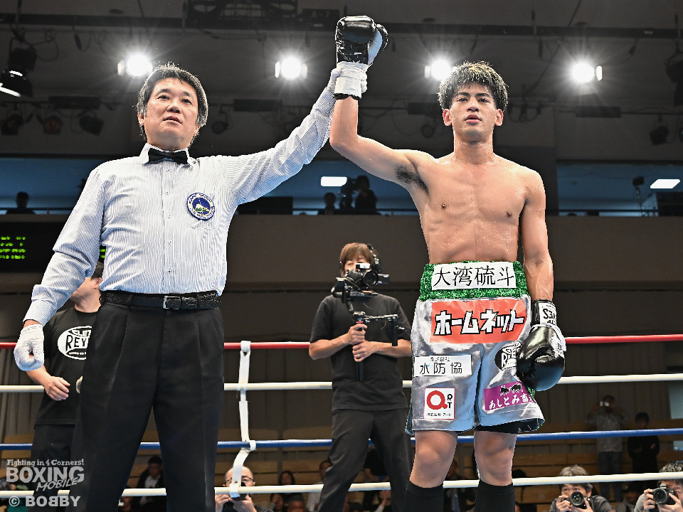 序盤から、大湾はディアスに付け入る隙を与えず圧倒。ジャブを上下に散らして相手のリズムを奪い、タイミングを計ってワンツー、左フックをヒット。さらにプレスをかけ、左のダブルで攻め立てると、3回に右カウンターが炸裂してダウンを奪った。再開後も畳みかけ、レフェリーストップに持ち込んだ。