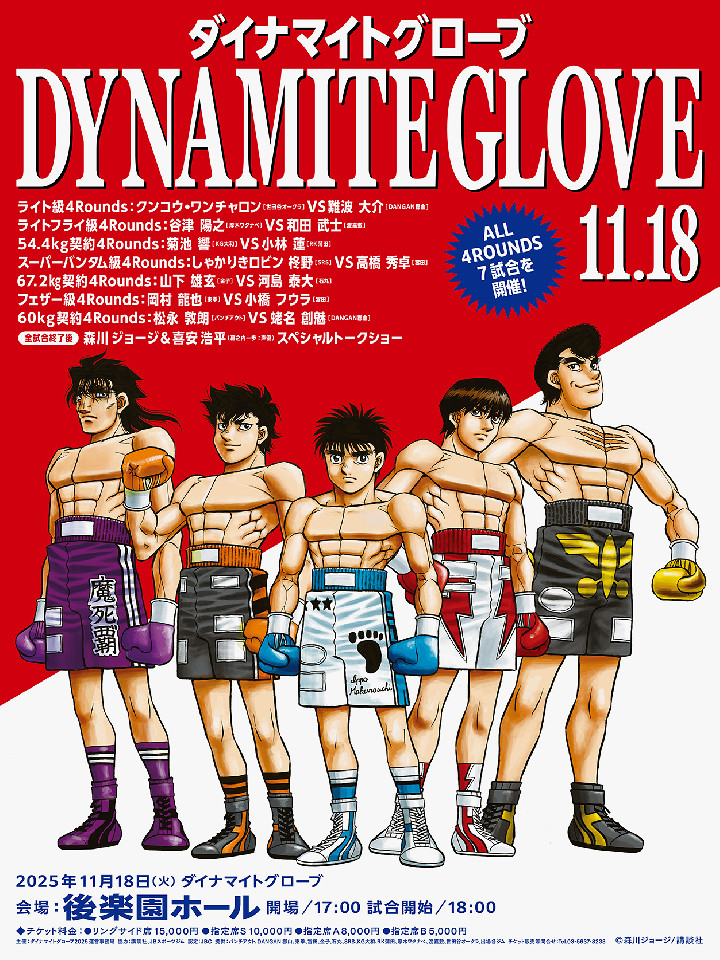 ■内 容:プロボクシング公式試合(オール4回戦・7試合)、森川ジョージ先生トークショー、限定グッズ販売、フォトスポット展開