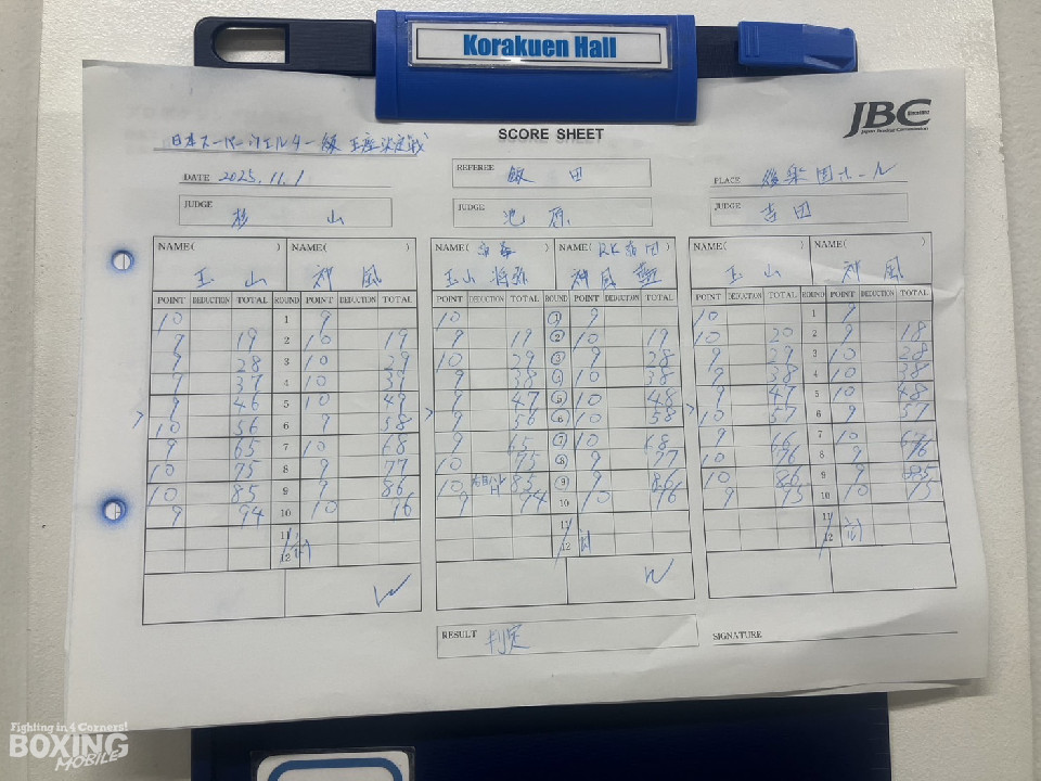 初回は、玉山がプレスをかけてワンツー左ボディで先制攻撃。しかし、2回以降は神風が右フックから回転力を活かした連打で、ジャッジに攻勢をアピールした。7回、神風は右フックで玉山をグラつかせると一気にスパート。しかし、ここを踏ん張った玉山は押し返した。8〜9回、玉山はワンツー連打で猛反撃。神風はやや手数が減った。勝負の10回、もう一度ギアを上げたのは神風。右フックをねじ込むと、最後の力を振り絞り勝利にしがみついた。ジャッジ2者の支持を得た神風に軍配が上がった。